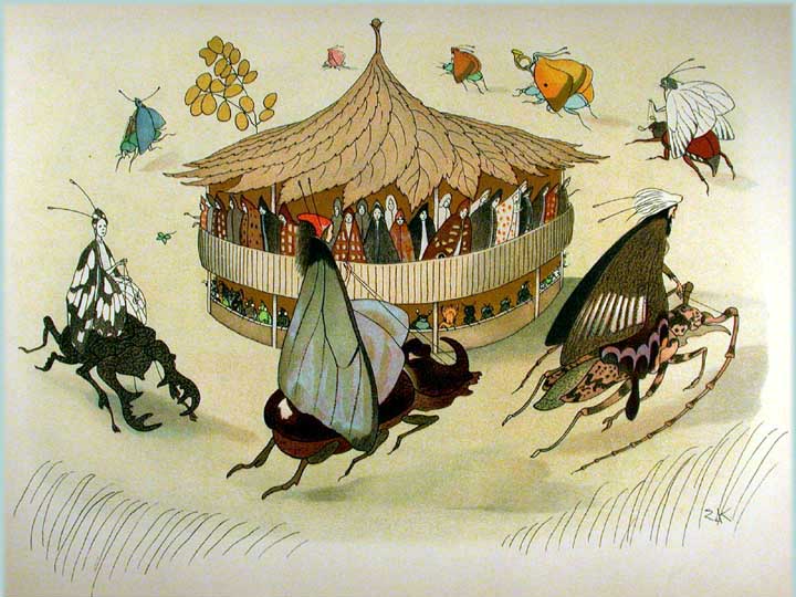 Chapeau caro Apoderus! Pensa che lo stesso Santo Alligo, nel citato Pittori di Carta, accosta Kreidolf proprio a Grandville discostandosi da altri critici che vedevano l'illustratore svizzero somigliare (forse più per gusto ed atmosfere) a Walter Crane. Confronti a parte sarebbe divertente sapere cosa se ne pensa tra gli Ortotteri circa questo immaginario umano che li accosta ad attività circensi. |