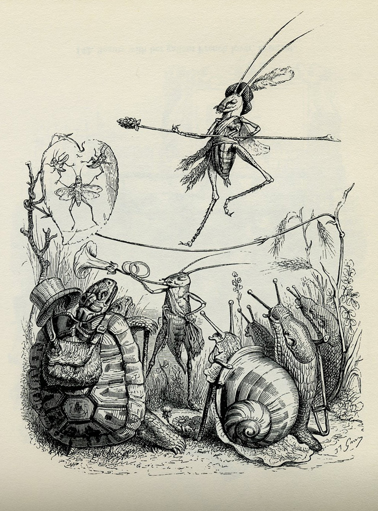Molto belle. Nell'umanizzazione degli insetti mi pare che si ispiri parecchio a Jean Ignace Isidore Gérard, in arte Grandville.