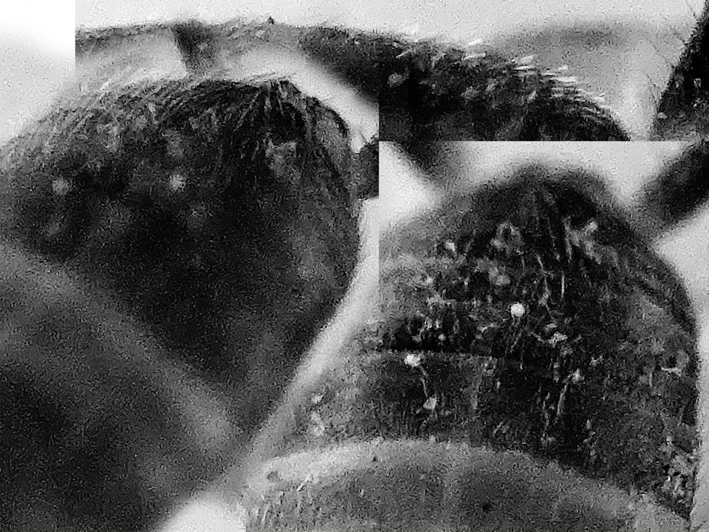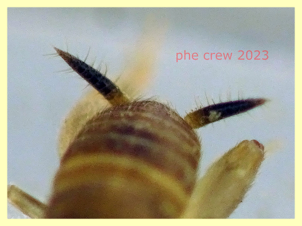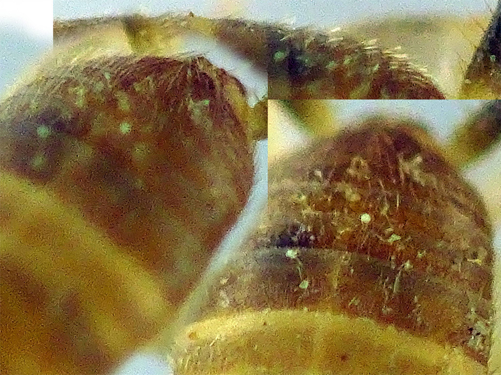 ...ho cercato di capirci qualcosa da un lavoro di Stalling che dice: M. acervorum : peli inclinati distanti corti e lucenti, pronoto con bordo posteriore chiaro e contrastante. M. myrmecophilus : peli inclinati distanti lunghi e appuntiti, pronoto senza bordo posteriore chiaro e contrastante. ...poi dice anche che M. hirticaudus e' l' unico ad avere una sola spina dorsale distale su metatarso….e qui, se non vedo male, sembra che ci sia…. ...secondo te da queste orribili foto i peli sono lunghi o corti ?  ....sicuramente distanti e inclinati ci sono… ….e anche il pronoto sembra che abbia il bordo posteriore chiaro e contrastante…