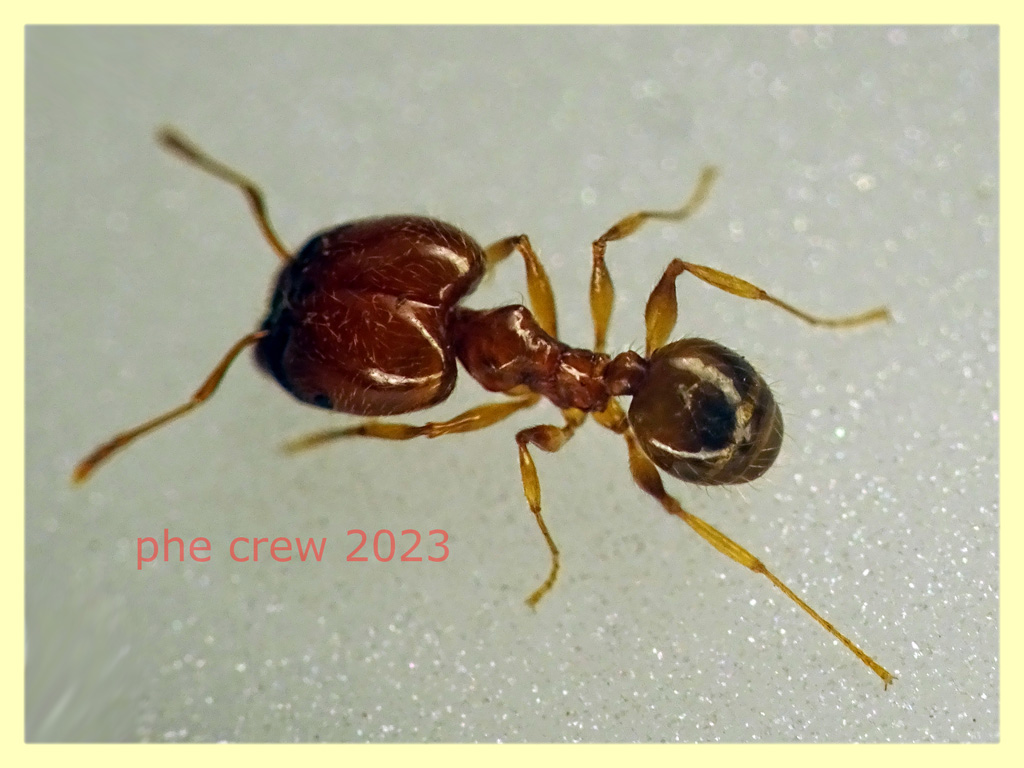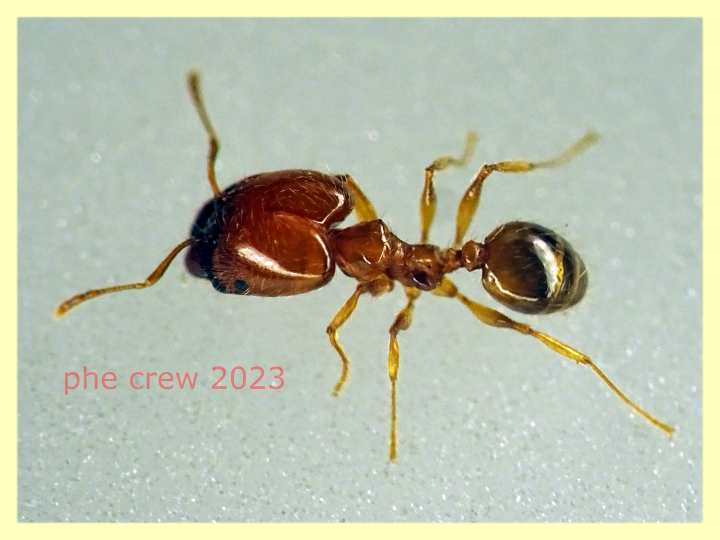 ….oggi alzando un pietrone ho trovato un enorme nido di Formiche. Nel mezzo dell' ammasso giallo brulicante ho scorto questo Myrmecophilus sp.. Si riesce a capire a che specie appartiene dalle Formiche ospiti ? ...ho notato che i Myrmecophilus sp. qui nel forum sono associati a Formiche nere, queste invece sono tutte gialle. ….queste sono le Formiche che lo ospitavano. Ne ho prelevate un po grandi e piccole….ho fotografato queste piu' grandi per comodita' che dovrebbero essere dei soldati. Per ulteriori dettagli sia per le Formiche che per il Myrmecophilus sp. chiedete pure.