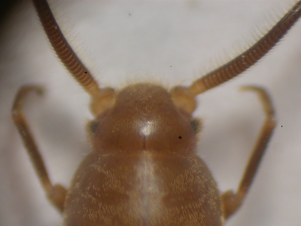 Trovato oggi sotto una pietra dove c'èra una colonia di Messor; dovrebbe essere Myrmecophilus myrmecophilus, l'unica specie in Sardegna, ma non si sa mai; per questo metto le foto. La bestiola è lunga circa 3: