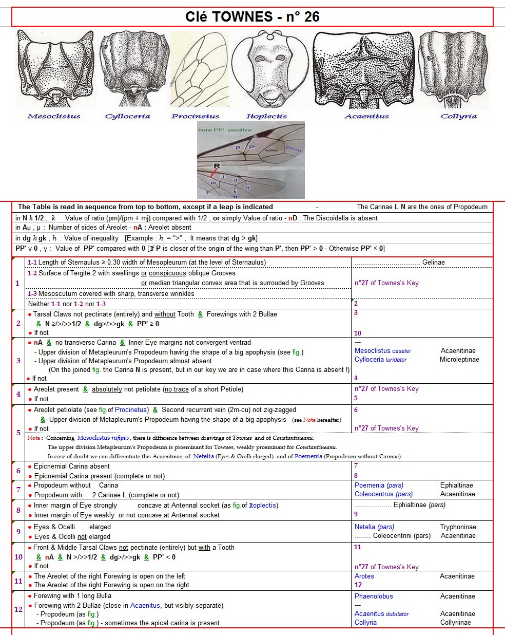 26 - Adaptation for the ♂ & ♀ (of France and Italy) of the subFamilies's Key contained in "The Genera of Ichneumonidae" of H. Townes (1969 - p.53/59] - Ichneumonidae
