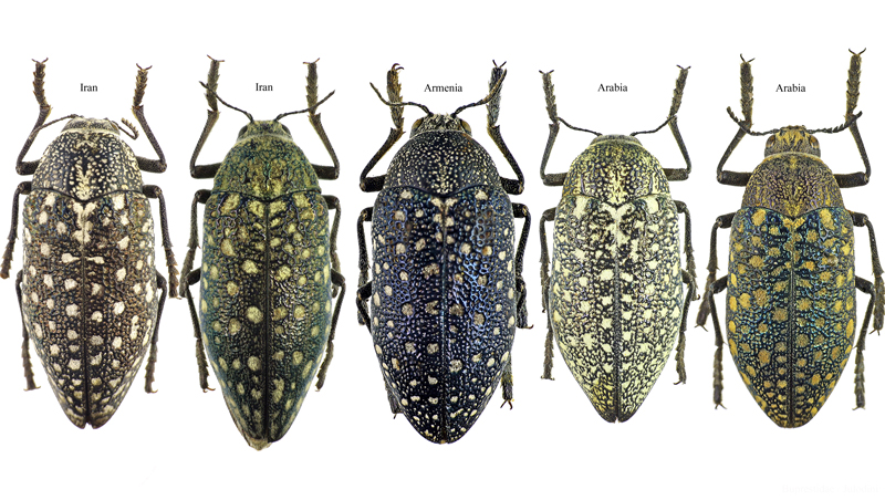 Quasi tutte le specie di Julodis sono molto variabili, e J. euphratica è una di quelle che lo sono di più. Ne ho anche altre forme, ancor più differenziate. Non cambiano solo da un posto all'altro, ma anche all'internod ella stessa popolazione. Nella tua foto i due ultimi esemplari sono sicuramente Julodis euphratica, mentre il secondo esemplare (dall'Iran) direi che appartiene ad un'altra specie. Per la precisione dovrebbe essere Julodis faldermanni Mannerheim 1837. |