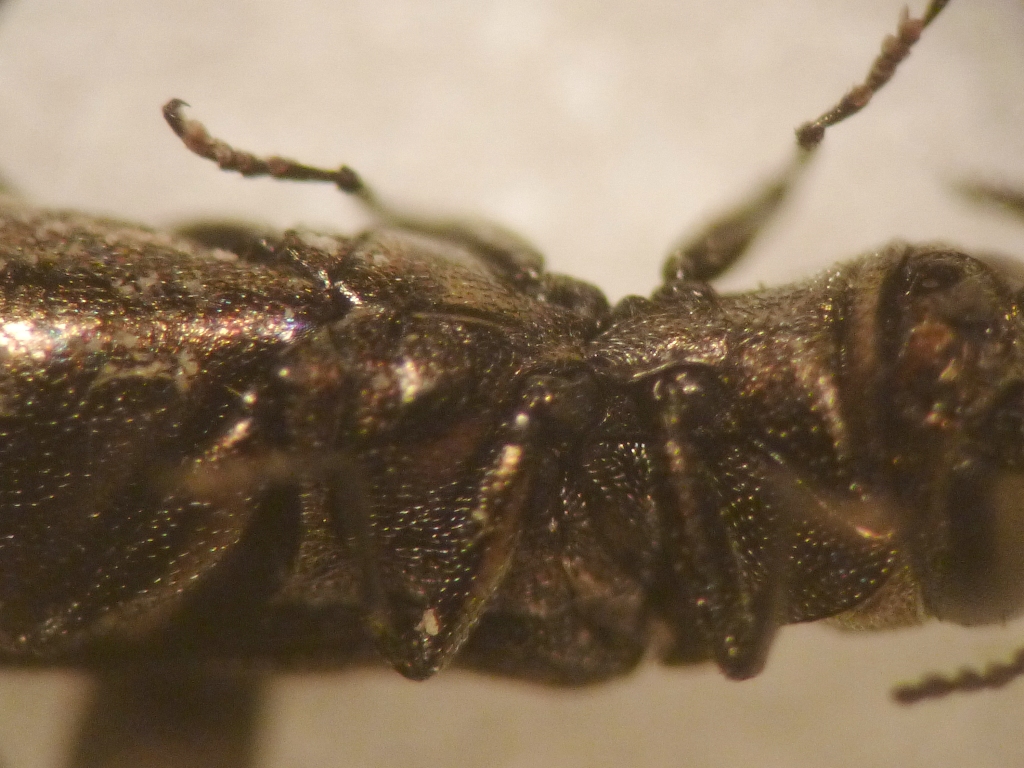 particolare in cui si nota una galleria a forma di C al contrario sull'elitra sinistra, con due fori alle estremità