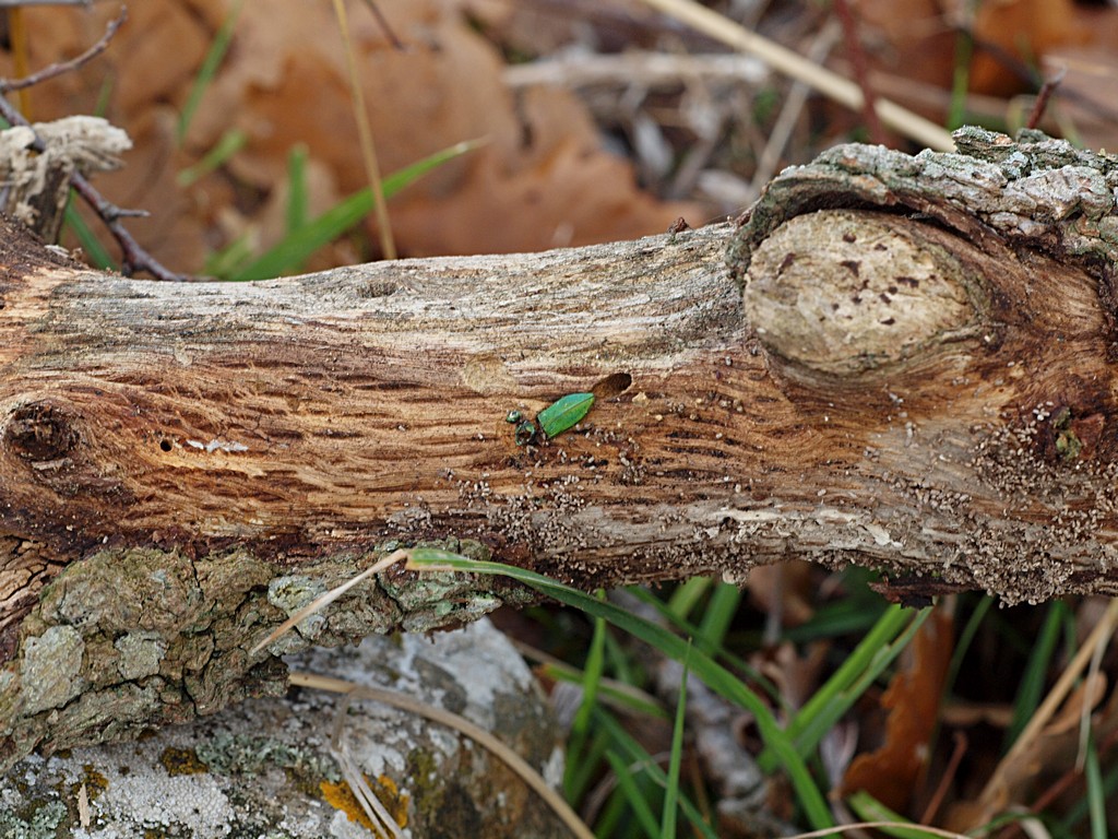 Ho provato a staccare un ramo morto da una delle querce, e sollevando la corteccia ho notato dei frammenti inequivocabili, presso un foro d'uscita altrettanto facile da identificare.