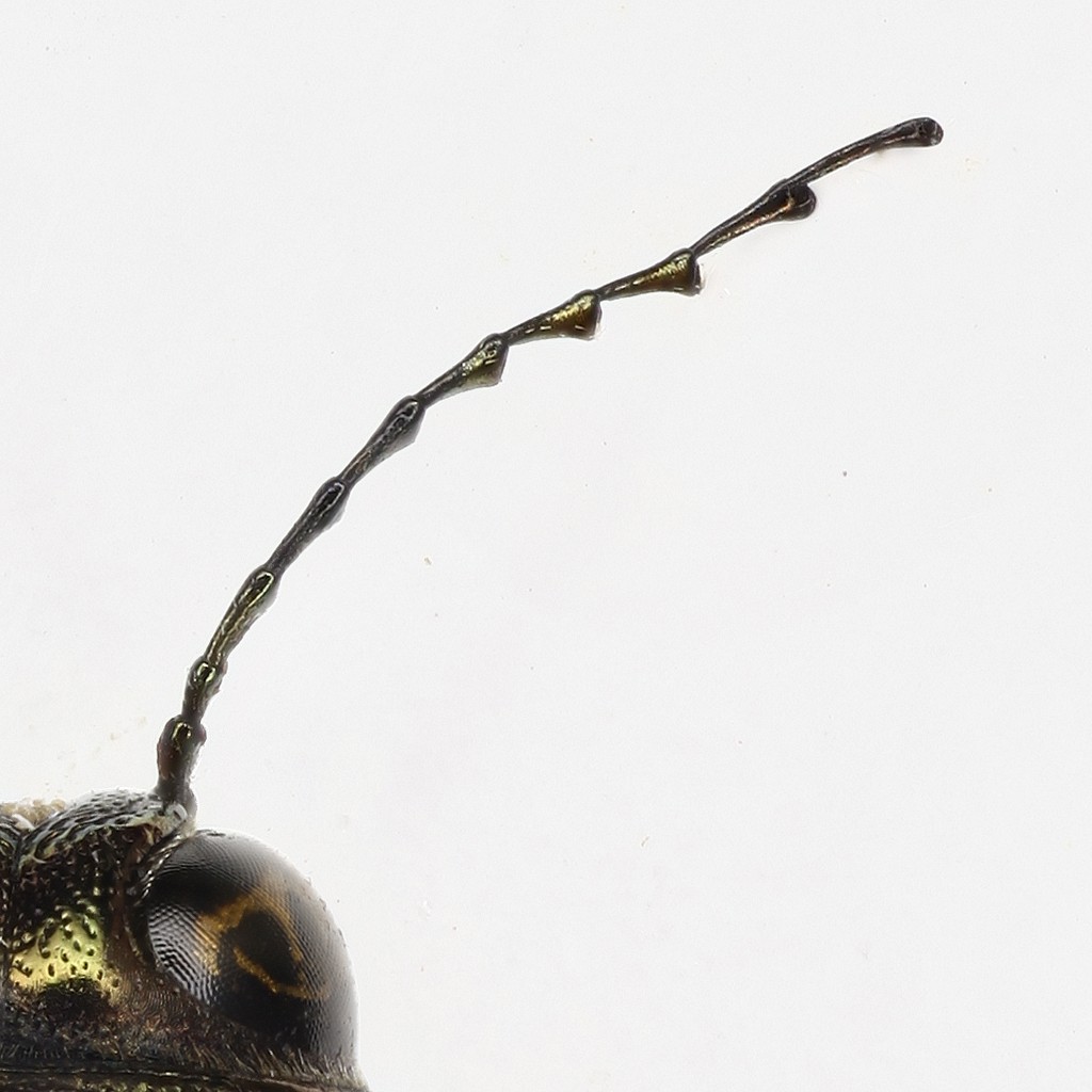 Ecco l'antenna a maggiore ingrandimento. Il primo articolo è in gran parte nascosto sotto la testa, per cui si vede poco. L'ultimo antennomero è il più insolito, perché di solito finiscono più o meno appuntiti a punta di lancia, o a losanga, ma non ne ho mai visti così, nei Buprestidi.