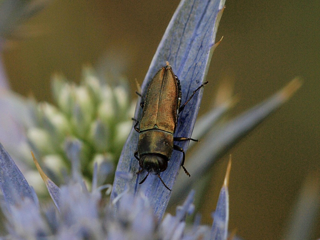 Anthaxia (Haplanthaxia umbellatarum umbellatarum (Fabricius, 1787) Lazio, Roma, San Polo dei Cavalieri, 800 m, 2.IX.2015, M. Gigli legit Stranamente stamattina ho trovato, su Eryngium amethystinum, alcuni esemplari di Anthaxia umbellatarum, specie molto comune, e di comparsa tardiva, che però in genere non arriva fino a settembre. Credo di non aver mai trovato Anthaxia attive in natura così avanti nella stagione, se non forse, una volta, delle Anthaxia mendizabali cianescenti e molto smozzicate. |