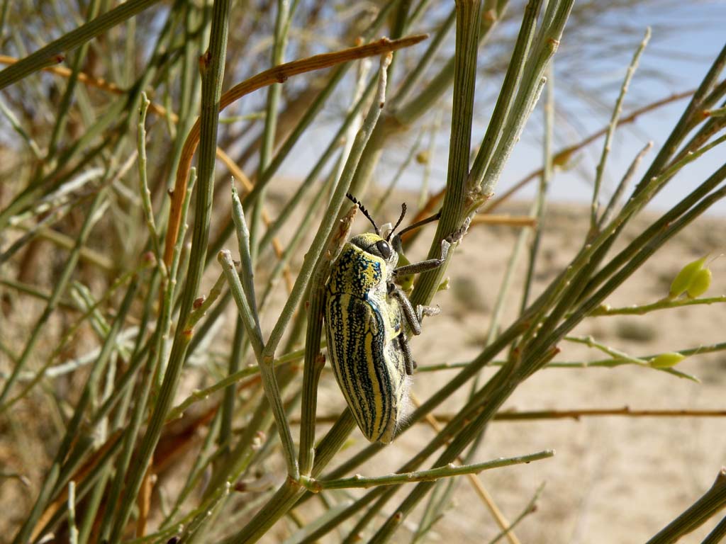 Julodis aristidis Lucas, 1860 - 20 km W Nefta, a pochi chilometri dal confine Algerino - 2 Aprile 2010. Su Retama sp. Inizio con questa specie, l'unica del genere trovata in serie, un breve report sul nostro recente viaggio in Tunisia cui hanno partecipato anche mia moglie Barbara e Gianluca Magnani. Come ho scritto in altra occasione, il tempo non è stato clemente e, soprattutto la stagione era drammaticamente indietro (almeno un mese). Evidentemente anche nel caldo sud e, principalmente, nel nord del caldo sud, l'inverno è stato vero inverno. Poco o niente era fuori per cui le foto rappresenteranno, salvo poche eccezioni, le piante ospiti di alcune specie di Cerambycidae che posterò nel settore apposito. |