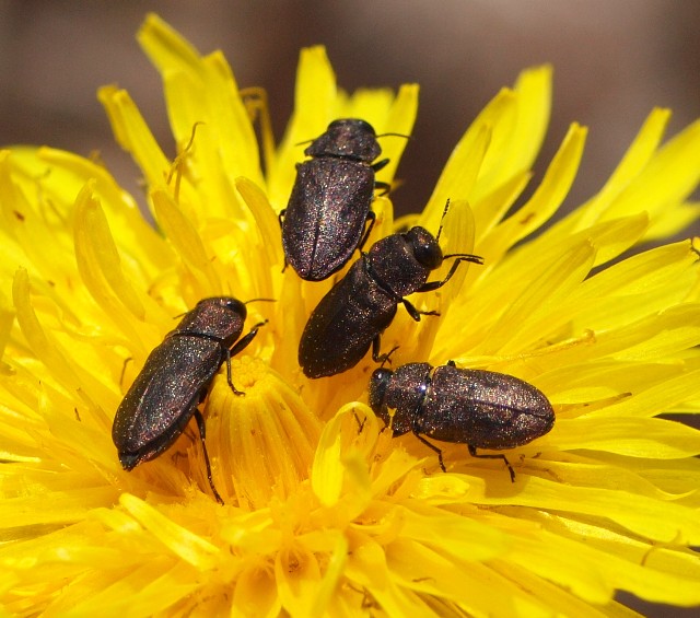 Se effettivamente sono Anthaxia (Melanthaxia) helvetica helvetica Stierlin, 1868, cosa di cui dalla foto è difficile essere certi, come già osservato da Francesco, probabilmente non lontano dai fiori su cui stavano c'era qualche abete attaccato. Le Melanthaxia, benchè, essendo floricole allo stato adulto, debbano spostarsi da dove sfarfallano, in genere non si allontanano mai molto dalla pianta da cui escono, di solito pochi metri o al massimo qualche decina. Quindi, se le piante attaccate non sono uniformemente diffuse nell'area, capita spesso che si trovino concentrate solo in alcune zone di limitata estensione, dove magari hanno una elevata densità.
