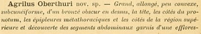 aug ha scritto: Scherzi a parte, che bestia strana. Infatti è quel che penso anch'io. Salvo poi scoprire che magari là ci sono una ventina di specie con queste caratteristiche. aug ha scritto: Ovviamente. Io di solito mi fido fino ad un certo punto delle determinazioni che trovo sul Web, e ancor meno di quelle fatte da coloro da cui compro gli insetti. Però in questo caso, sia chi ha determinato l'esemplare sul Web (Jean Louis Giuglaris), sia quelli da cui ho comprato il mio, sono persone di una certa competenza, ed inoltre credo siano in contatto con Gianfranco Curletti, per cui non saprei dire chi possa aver ragione. Ora vedo se trovo la descrizione di Agrilus oberthueri tra i lavori di Kerremans che possiedo, o se magari si trova sul Web, per capire se corrisponde ad uno dei due. Il lavoro credo sia questo: KERREMANS, C. 1897. Contribution a l'étude de la faune intertropicale Américaine. Voyages de M. E. Gounelle au Brésil. Buprestides. Mémoires de la Société entomologique de Belgique 6:1-146.