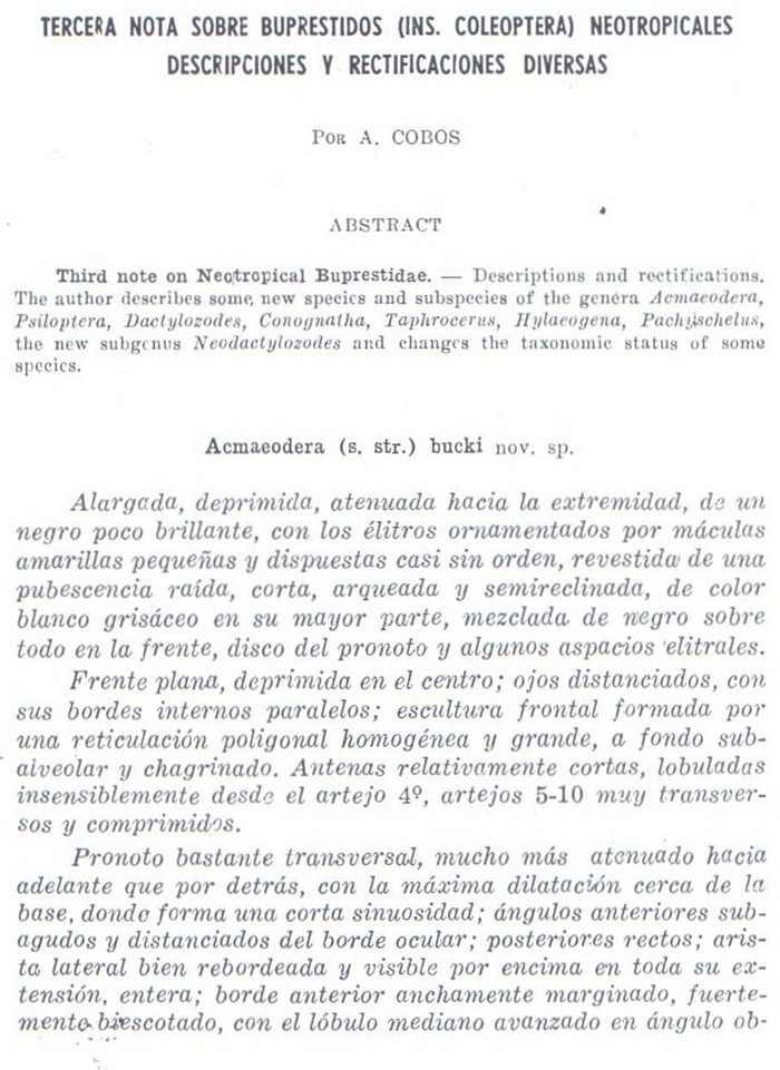 Daniele Baiocchi mi ha fatto avere il lavoro di Cobos con la descrizione di Acmaeodera bucki Cobos, 1958, e come potete vedere dal disegno che riporto, sembra proprio che si tratti di questa specie o di una molto vicina. La variabilità della maculazione è normale nelle specie di questo genere.