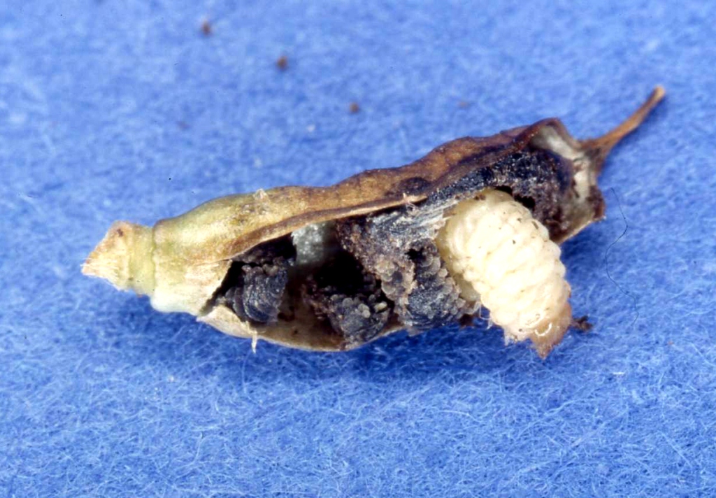 Raggiunta la maturità, quando il frutto si apre, la larva cade a terra e penetra nel terreno, dove trascorrerà la cattiva stagione.
