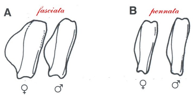 Lobi del margine dorsale delle coxa mediane dilatati per nulla nel maschio e appena nella femmina; lobi del margine dorsale delle coxa posteriori non dilatati nel maschio e nella femmina