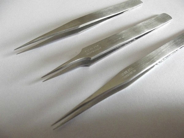 Io per gli insetti piccolissimi (meno di 2 mm) non uso proprio le pinzette, ma uno spillo. Basta che sia leggermente bagnato, perchè appoggiandolo sull'insetto questo vi resti attaccato quel tanto che basta per spostarlo. Cosa che funziona anche con insetti di pochi mm, usando un pennellino.