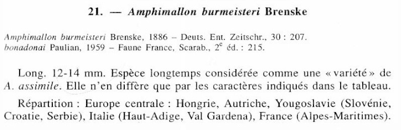 aphodius ha scritto: The coloration is also different: A. burmeisteri is lighter, sandy yellow-brown, while A. assimile is usually darker brown. Also, the length ratio of terminal tarsomere of anterior leg and its claws are different. May I ask what is the reference for these diagnostic characters? I do not remember they were cited in the last taxonomic assesment of the two taxa (Rössner E. & Krell F-T., 2001) As I don't read German, I may be wrong, sure they are not considered in the key at the end. (Rössner E. & Krell F-T., 2001. Amphimallon burmeisteri Brenske, 1886: Designation des Lectotypus und Abgrenzung von A. assimile (Herbst, 1790) - die Schwärmzeit als entscheidendes Bestimmungsmerkmal. Entomologische Blätter. 96: 171-198)