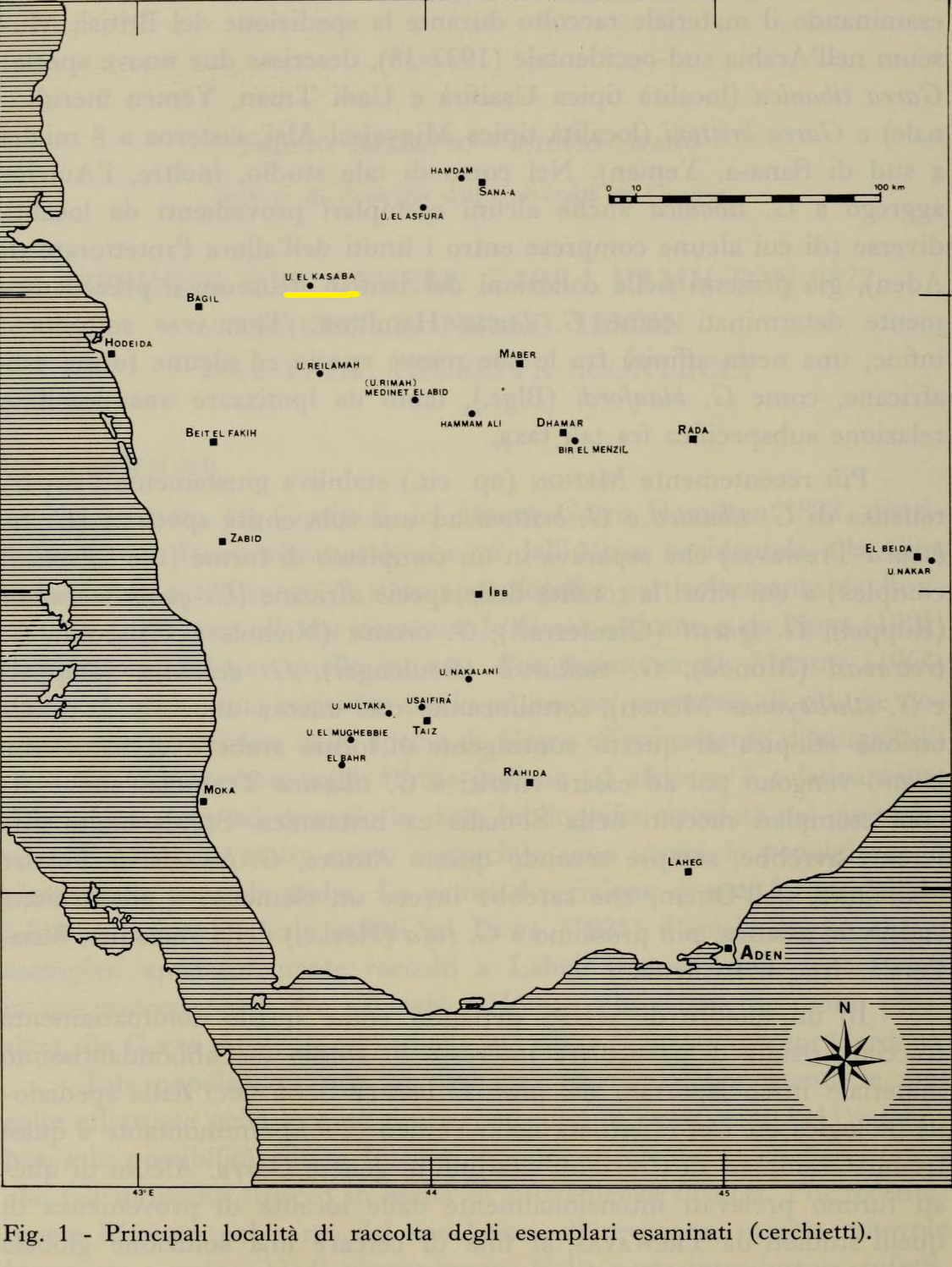 EUREKA Da: Balletto E., Spanò S., 1977 - Ciprinidi del genere Garra Hamilton 1822, raccolti nello Yemen dal Prof. Giuseppe Scortecci. Annali del Museo Civico di Storia Naturale `Giacomo Doria', 81: 246-287 Cartina riportata a pag. 248: Particolare: Prendendo a riferimento la distanza fra le due località di Bagil = (Bajil) e Hodeida = (Al Hudaydah) è facile ritrovare con buona approssimazione l'area in cui si trova El Kasaba, utilizzando questa mappa (clicca su "full-map" in alto a destra e poi rimpiccioliscila un po' per inquadrare anche Al Hudaydah, sulla costa. Se la rimpicciolisci ulteriormente vedi anche Sana'a)