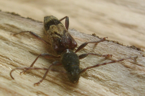 Da un ciocco appena spaccato sbucava a metà questo bel cerambicino. Per un pezzo è rimasto immobile, pensavo che fosse morto per la botta presa... ma una volta dentro casa col tepore si è svegliato e (molto lentamente) è uscito fuori dal suo buco. Ha un aspetto veramente particolare, non credo ci siano altri con cui confonderlo: Anaglyptus gibbosus (Fabricius, 1787).