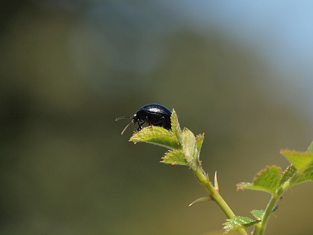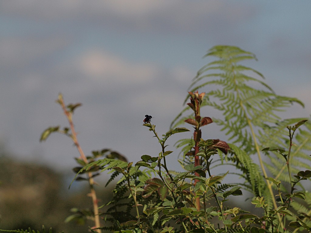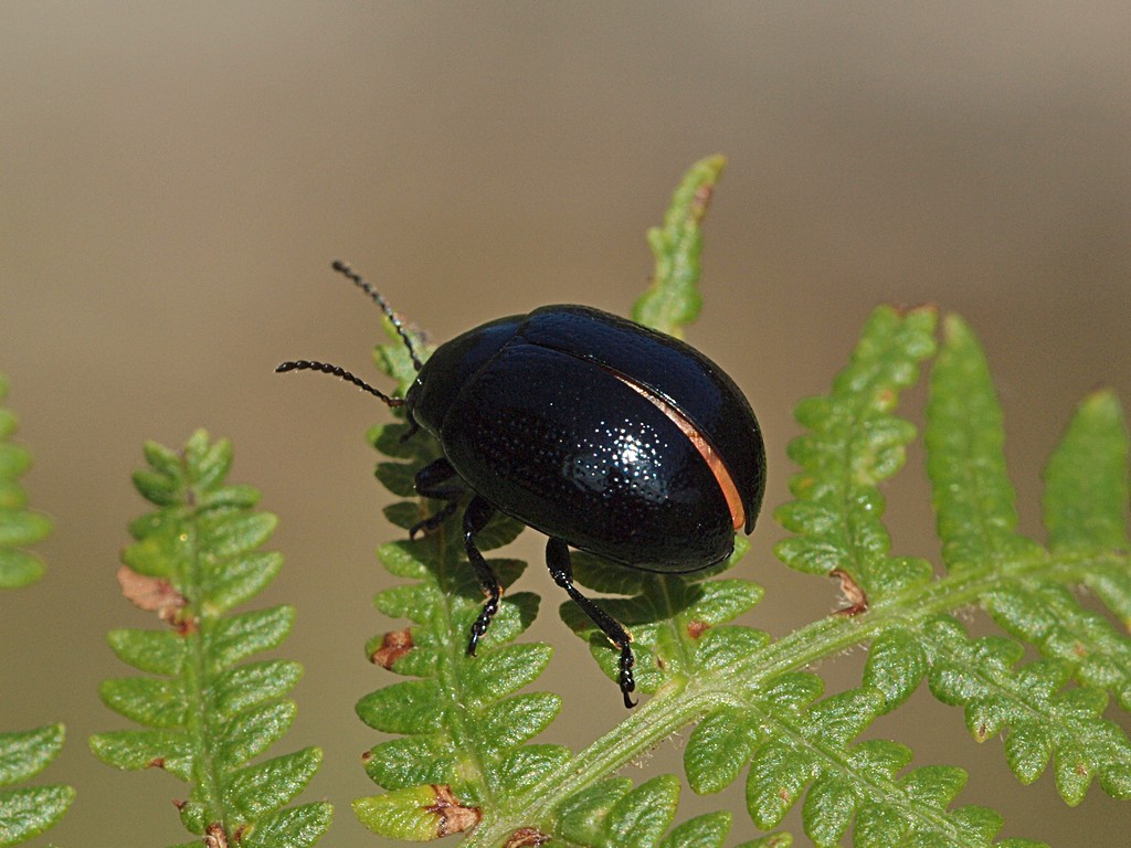 A quel punto mi sono fermato in uno spiazzo erboso circondato da felci, ha spalancato finestrini e portellone per farli uscire (erano entrati pure dentro) e nel frattempo ho dato un'occhiata in giro. Coleotteri praticamente inesistenti, malgrado fosse quasi mezzogiorno. Unica eccezione, ben tre, dico tre, Chrysolina haemoptera! Uno dei Chrysomelidae più comuni nel Lazio.