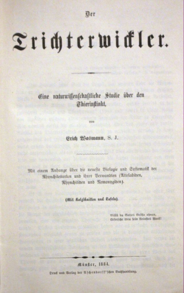 Vorrei raccontarvi una storia e poi farvi una domanda, per me importantissima ma probabilmente fuori tema. Il libro che ho cercato più di qualsiasi altro nella mia vita è sicuramente "Der Trichterwickler" di Erich Wasmann, edito nel 1883. Coniuga le mie due passioni, gli attelabidi "sigarai" e il darwinismo. L'autore, gesuita, ragiona per 300 pagine sulla teoria dell'evoluzione, riferendola agli istinti del Deporaus betulae. Dopo 30 anni di vane ricerche in tutta Europa, mi capita di trovarne una copia (e quasi contemporaneamente di scaricarne il pdf dalla rete). Eccolo: