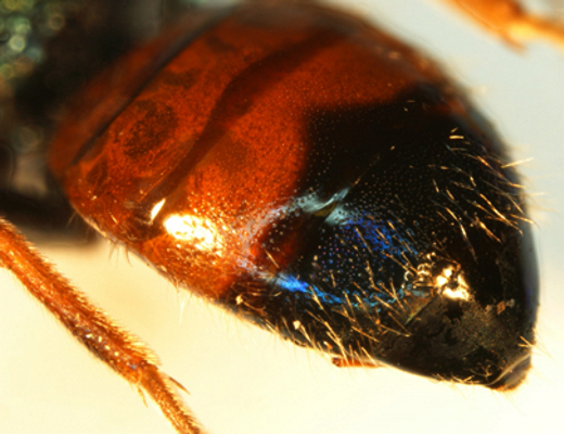 ma per essere sicuro di non aver visto male ;) , un ingrandimentino dell'avancorpo, per vedere bene il pronoto, e uno dell'estremità addominale un po' di fianco, per controllare se la parte nera dell'addome ha almeno in parte riflessi metallici violetti