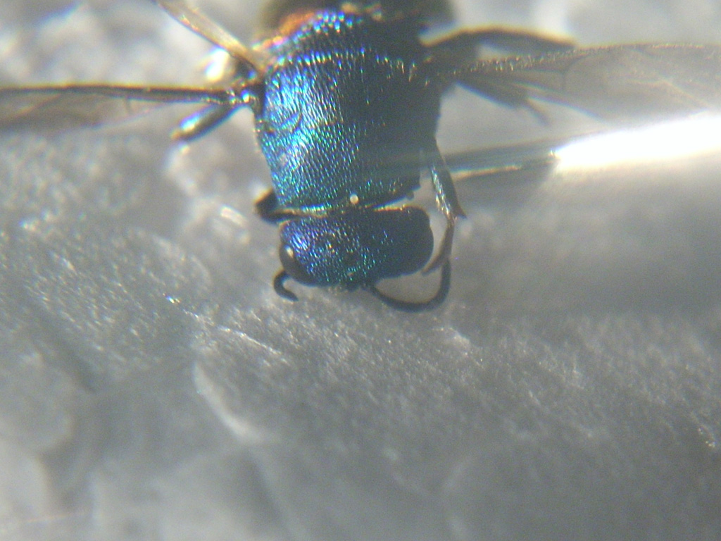 mi verrebbe da dire femmina di Hedychrum gerstaeckeri, ma per confermarlo avrei bisogno una foto laterale del torace, con dietro uno sfondo ben illuminato, in modo che in controluce si veda bene la pubescenza lungo il profilo dorsale (pubescenza che devi cercare di mettere a fuoco)
