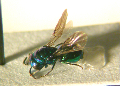 Vi posto poi delle foto di un crisidide catturato il 6/IX/2010 a Mercogliano in provincia di Avellino. L'animaletto misura circa 5 mm e dalla bassissima qualità delle foto non penso che si possa risalire alla specie. E' stato fissato su cartoncino bristol con una goccia di gomma arabica, ma non so se ho fatto un buon lavoro o meno... accetto consigli.