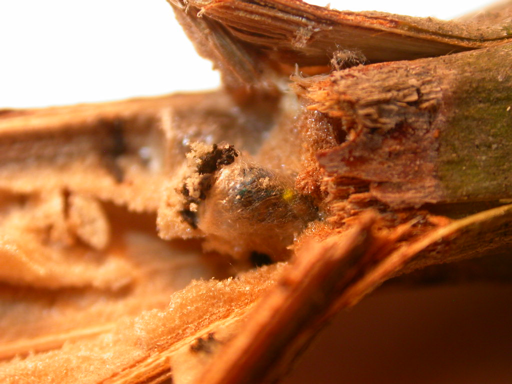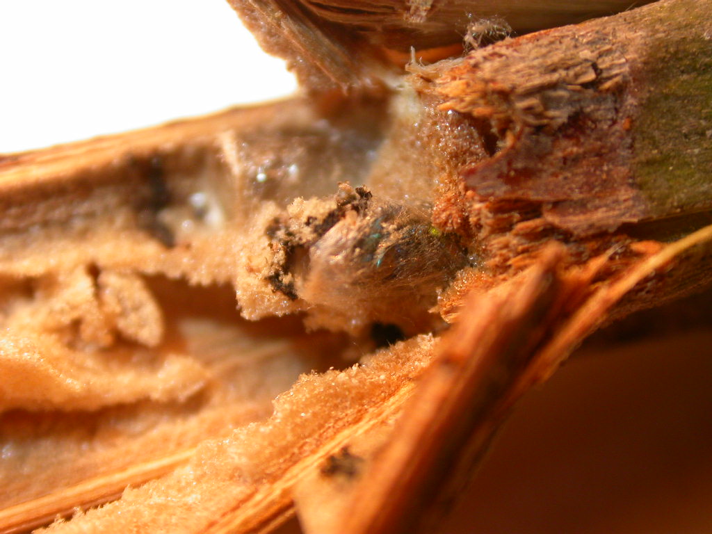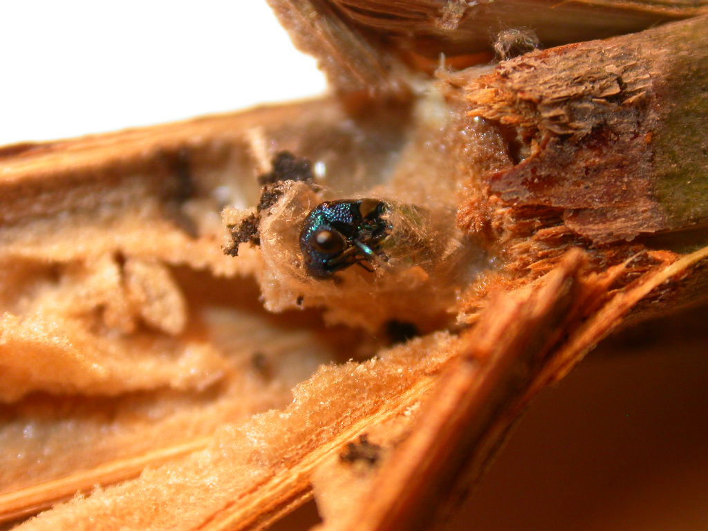 Poiché però l'ho trovato dentro la sua celletta, ho pensato fosse interessante documentarlo: appena ho aperto il rametto si notava una celletta con un bagliore metallico dentro: