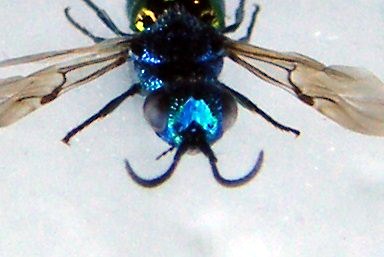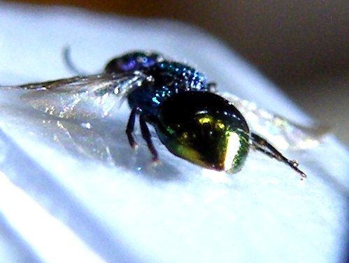 Hai provato ad usare un bicchierino di plastica, od un conetto di carta pergamena, o qualunque altra cosa per diffondere la luce? Se l'illuminazione è troppo "cruda" è difficile che le foto dei Chrysididi ti possano venire molto meglio di così, perchè fanno troppi riflessi.