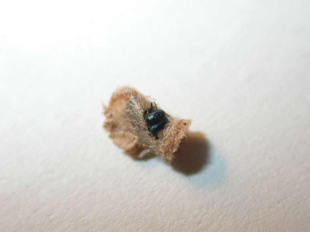 Oggi ho ottenuto da allevamento uno Pseudomalus da rametti di rovo che ho raccolto a novembre 2012. L'esemplare misura 4.5 mm. Da notare la punteggiatura praticamente assente presso mesonoto e pronoto: Un dettaglio del mesonoto praticamente liscio: Alcune fasi dello sfarfallamento: |