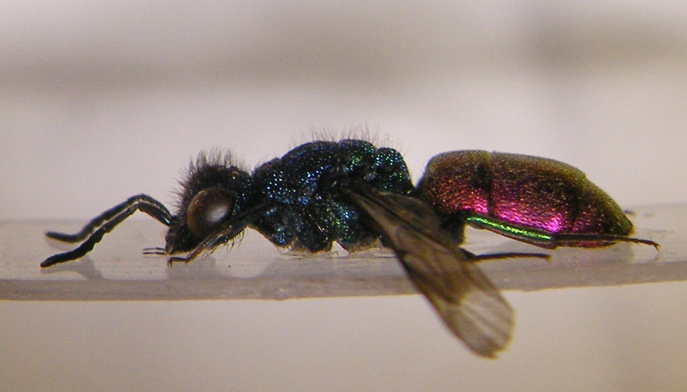 Questa è una Chrysura! :to: 9 mm, addome rosso. Pelacci irti e neri su tutta la parte anteriore ma non sull'addome dove sono chiari e, in parte, coricati.