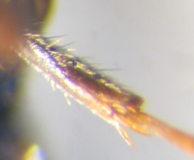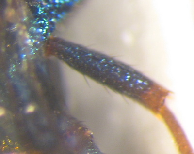 no, purtroppo la fossetta si trova sul lato della tibia non visibile nella tua foto, se osservi l'insetto da sopra e un po' da dietro vedi che la tibia al lato interno è percorsa per tutta la lunghezza da una fascia brunastra non metallica... la fossetta si trova lì