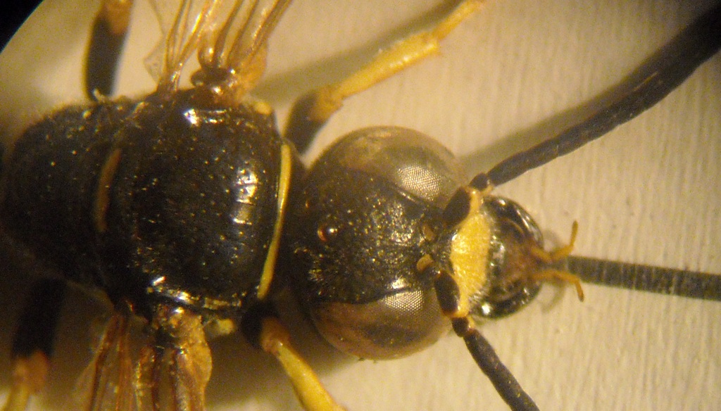 Il mesonoto pare a punteggiatura molto grossa: se così è penso più al quinquefasciatus (Panzer, 1798) che dovrebbe avere inoltre gastro a punti fini radi e superficiali, labbro nero, nessuna linea chiara all'interno degli occhi e lunghi peli al centro degli sterna IV-V/VI. Verifica se tutto combacia. Nisson interruptus (F.) è suo cleptoparassita.