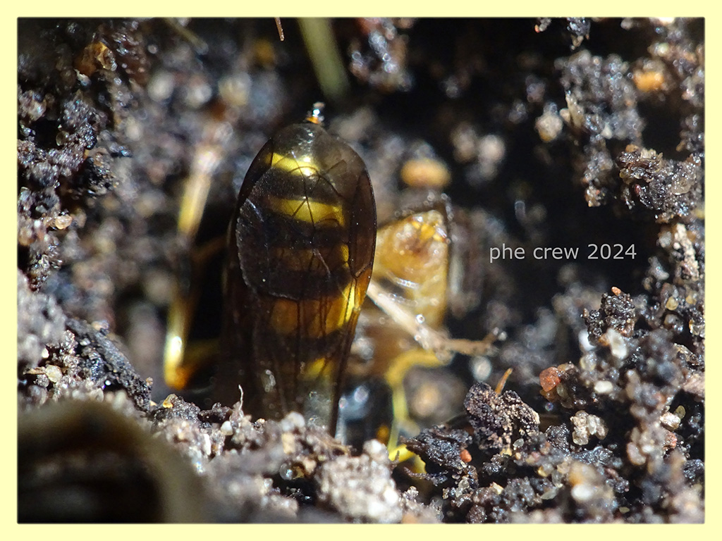 ...dopo aver trovato il bel pdf di Rinaldo Nicoli Aldini: "On the nesting behaviour of Gorytes laticinctus (Lepeletier) (Hymenoptera, Sphecidae)" - 2002 ...preciso alcune mie osservazioni. Intanto la femmina depone un solo uovo a cella che e' composta da circa 3 Cicaline, percio' puo' darsi che io abbia tirato su due celle vicine. Il cunicolo si puo' prolungare anche fino a una dozzina di cm. e puo' comprendere piu' celle, io mi son fermato sui 4 cm quando ho visto le prime Cicaline....quindi puo darsi che abbia preso le prime due celle e piu' a fondo ce ne erano altre.....o era solo composta da solo queste due celle...oppure la tana era in fase di ampliazione.