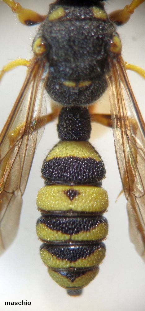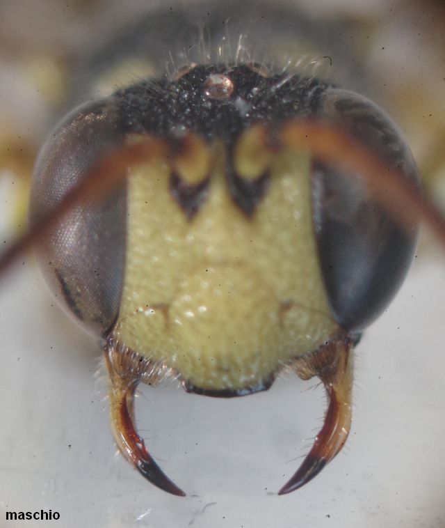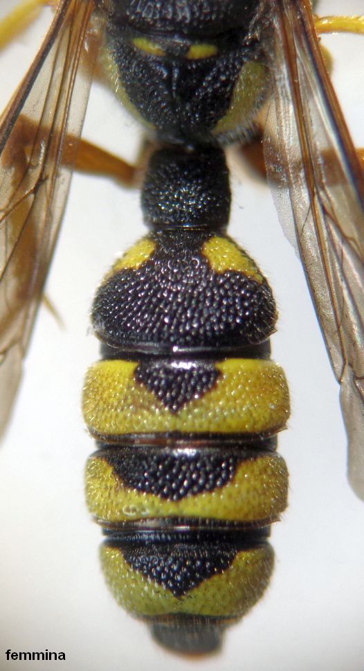 La specie, è peculiare anche per la carena interantennale (freccia) che si prolunga sin sotto l'ocello anteriore, in entrambi i sessi; le femmine hanno il clipeo un po' incavato, convesso nei maschi. Le due femmine hanno diversa estensione delle macchie ai lati del 2° tergite. Femmina con area pigidiale opaca e finemente microsculturata, nel maschio essa è lucida tra grossissimi radi punti.