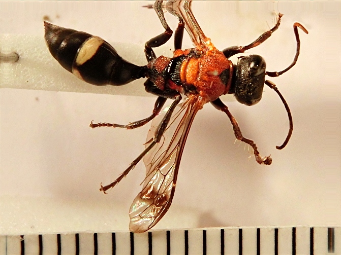 Questo imenottero (sfecide?) dei Colli Albani è stato raccolto a vista a Rocca Priora nell'abitato a circa 700 m s.l.m. diversi anni fa.
