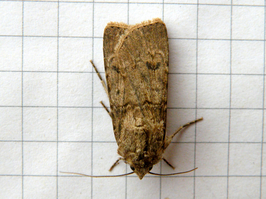 Ciao, per me decisamente Agrotis. Non ho una chiara idea della taglia (di quanto sono i quadretti?), ma la più probabile è A. puta. Ho però una forma quasi identica, strano anche solo ad immaginarlo..., di A. exclamationis trovata in prati umidi della reione alpina.