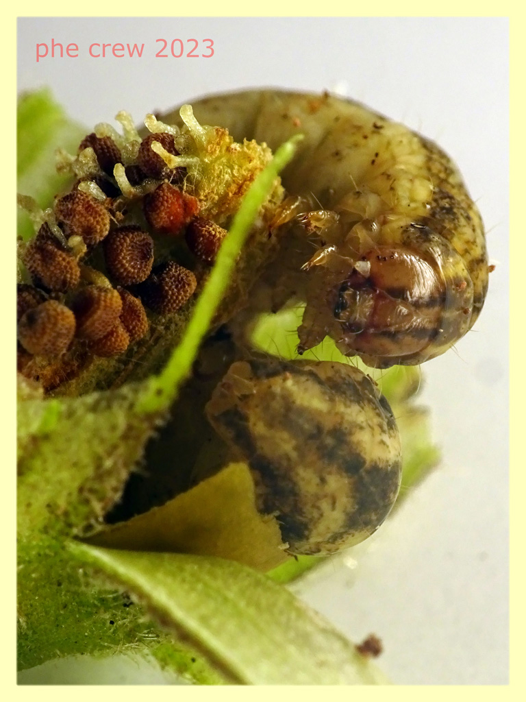 ...ho prelevato alcuni boccioli di Silene sp. con fori d' entrata e li ho messi da parte per vedere cosa ne usciva. Ma ovviamente non ho resistito e li ho aperti ...una bella larva di Lepidottero che era orrotolata nel bocciolo della Silene ancora immaturo e ne mangiava i semi. ...poi la pupa... ...e infine l' adulto, e' risultata essere Hadena bicruris ...questi sono i boccioli con i fori d' entrata e la pianta ospite: Silene sp.... ...dato che questa era gia' cresciutella, manca dunque la foto della larva negli stadi precedenti che ho fotografato in un altro bocciolo (inizialmente sembrava un Tortricidae...poi crescendo)...eccola qui: |