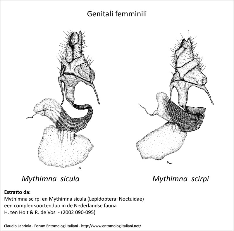purtroppo non ho materiale in merito :( ma ho trovato in rete un bel documento: Mythimna scirpi en Mythimna sicula (Lepidoptera: Noctuidae) - een complex soortenduo in de Nederlandse fauna - H. ten Holt & R. de Vos - (2002 090-095), da cui cito (perdonate la traduzione :oops: ):