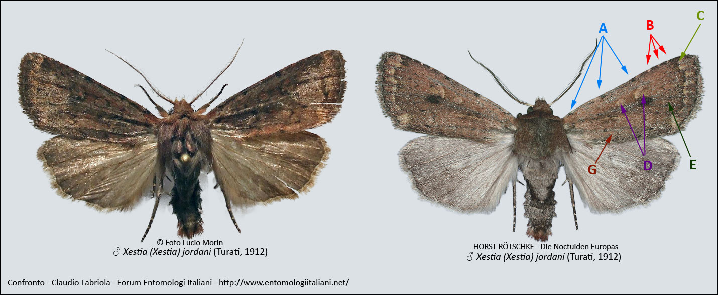 Xestia jordani (Turati, 1912), non mi convince del tutto :oooner: Ho provato a fare un confronto fotografico con un esemplare proveniente dal CD Noctuiden Europas e una foto recuperata dal web, che però purtroppo non ho qui con me e quidi non posso mostrarvi, conto di farlo questa sera o al più domani, dove ho potuto osservare che alcuni punti del pattern, secondo me indicativi, non coincidono con l'esemplare mostrato.