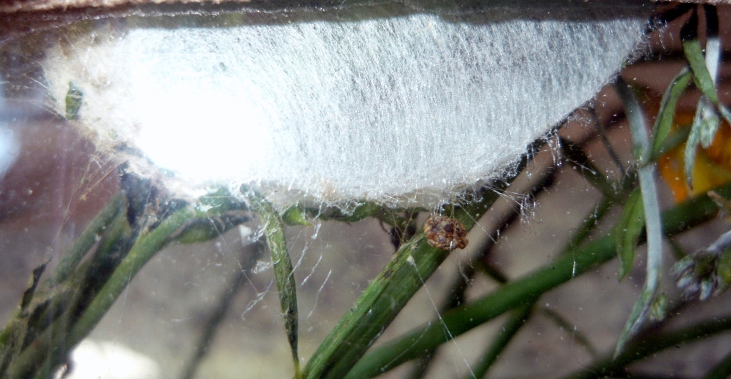 Così ho fatto (infilzato rametti fioriti di ginestra su spugna per fioristi) ma ieri si era già posizionata tra i rametti, iniziando a costruirsi un bozzolo sericeo...