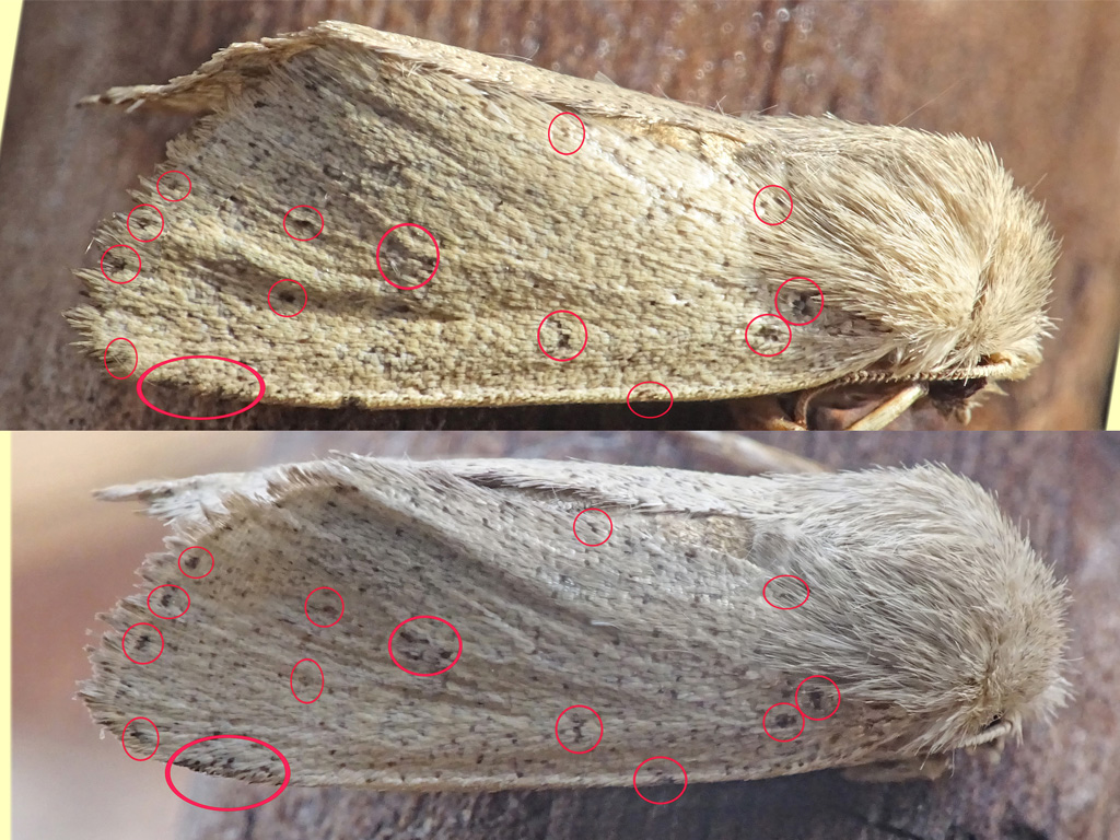 ….ciao Giorgio, siccome mi e' venuto il dubbio su non averla pulita bene, ho rispecchiato l' ala sinistra (sotto) e l' ho accostata con la destra (sopra); e ho cerchiato tutti i punti che si vedono meglio (quelli piu' piccoli e fini l' ho snobbati) che combaciavano ...isomma quelli non sporchi  ….giusto per capirci un po di piu'. Riesci con questi punti cerchiati a capire se si tratta di ruticilla ? ...comunque in messaggi in attesa di pubblicazione c'e' un altro esemplare che varra' postato domani e sembra la stessa specie.