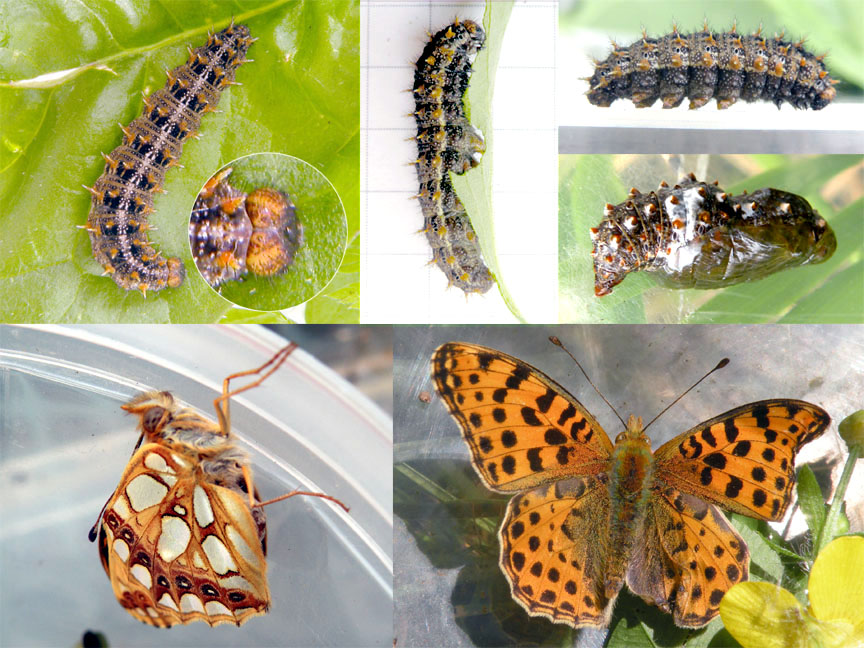 Il bruco si trovava sul terreno in una zona dove cresce la Viola kitaibeliana (Viola arvensis?). Non ero certa si trattasse della specie in questione pertanto ho provato ad alimentarlo con varie piante, tra cui la viola sopracitata e la viola odorata, che ha dimostrato di gradire. Nel giro di pochi giorni è incrisalidato. A metà maggio la farfalla ha preso il volo, nonostante presentasse le ali leggermente asimmetriche, come si può evincere dalle immagini.
