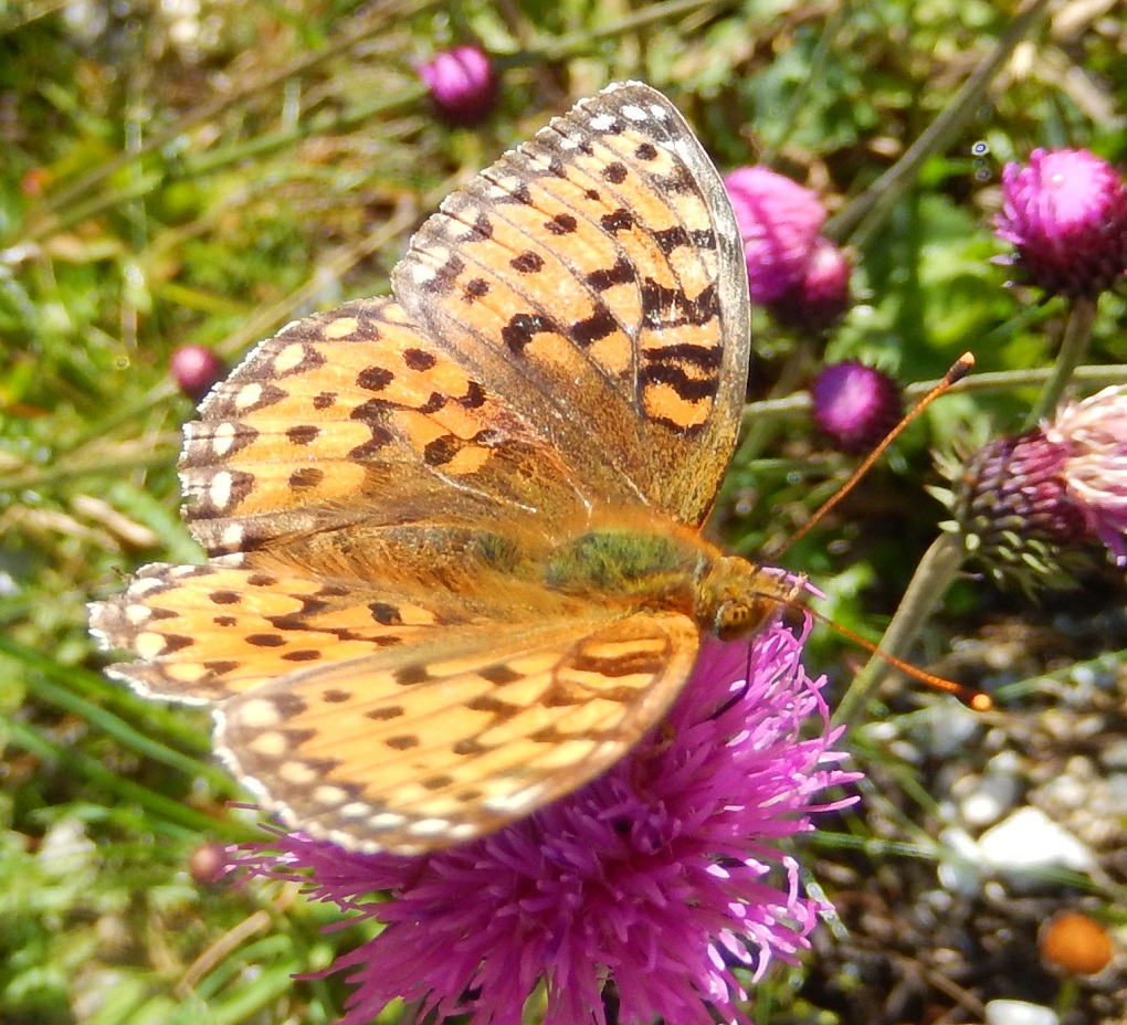 Buonasera, le chiavi dicotomiche online mi portano fino a questo genere (anche se forse sarebbe possibile Boloria), ma... mi dicono che per la specie, devo guardare la parte inferiore delle ali. Naturalmente non sono riuscito a fotografarla. Misura importante, forse più di 5 cm... ma quando ho l'impressione di misure del genere, diffido dall'effetto pescatore. A circa 2000 mt. Mi confermate che ci si deve accontentare del genere, e che è Argynnis? Grazie! |