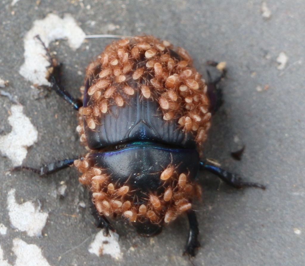 Capisco l'infestazione di un Melolontha o di un Oryctes, ma come fanno a restare attaccati a coleotteri come Geotrupes, Nicrophorus, Hololepta, che strofinano sistematicamente il corpo contro terra, legno morto ecc...