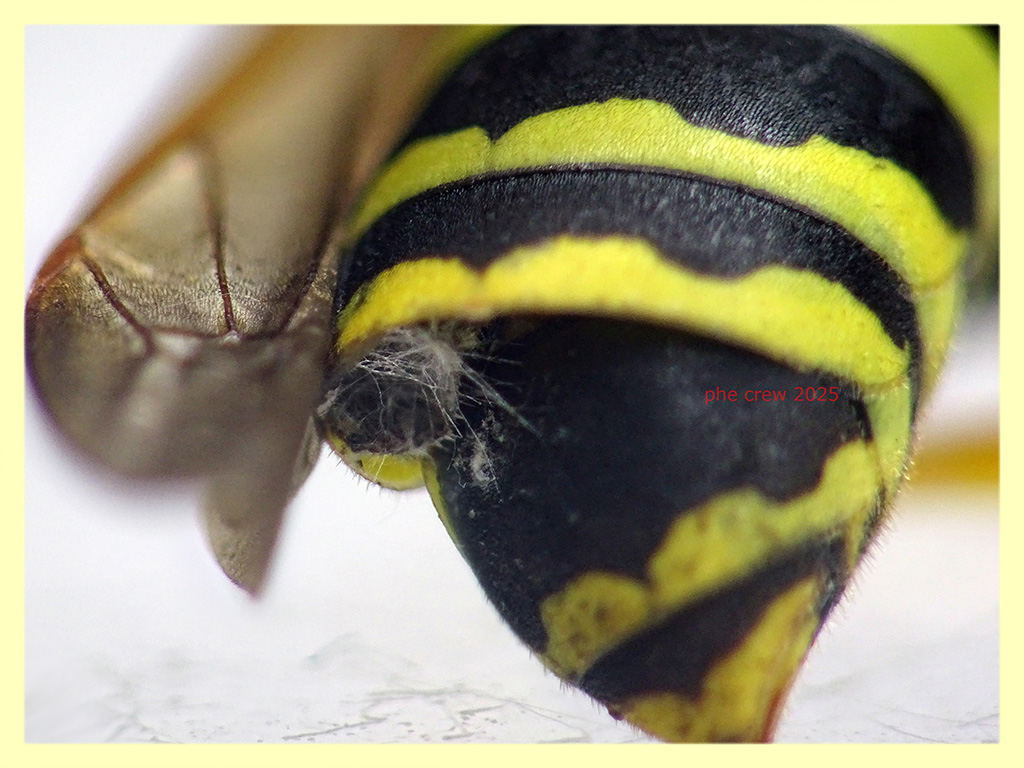 ...l' allevamento non e' andato a buon fine, la Polistes sp. stamani era viva e vegeta, ma nel pomeriggio la trovai stecchita. Ho delle varie ipotesi per questa morte che non sto qui ad elencare, ma sicuramente il miele non c' entra nulla. Ecco allora un buon motivo per fotografare meglio l' addome con lo Strepsiptera ! Sono rimasto stupito quando misi a fuoco con l' obiettivo macro, ne trovai un buco tutto ammuffito....sembra che il soggetto sia sfarfallato da cosi' tanto tempo che la muffa ebbe modo di diffondersi prima che l' ospite morisse ! :o