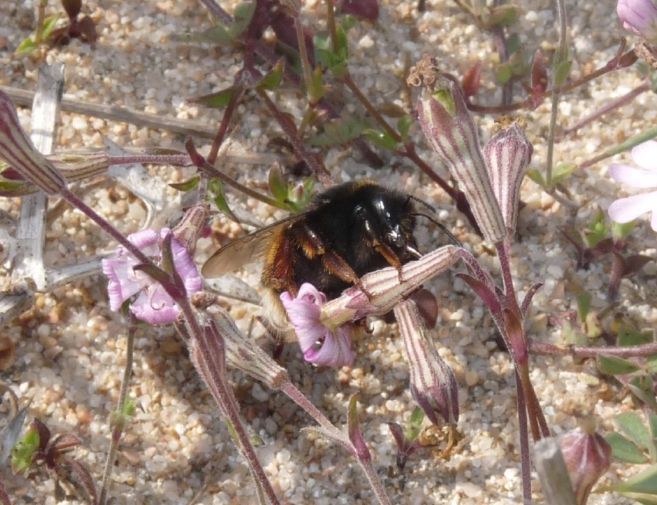Titolo originale: "Bombi evoluti".Avevo letto di questo comportamento su FNM e la scorsa primavera ho avuto la fortuna di documentarlo e di postare là le mie foto. Penso che anche qui ci potrebbe essere qualcuno interessato e che non ha letto quella discussione. Il prato era composto essenzialmente da due tipi di fiori: una leguminosa gialla strisciante e questi altri fiori rosati a calice lungo. La maggior parte dei bombi frequentavano solo i fiori gialli, dal calice di lunghezza accessibile, mentre alcuni - direi 1/10 - avevano imparato il trucco per sfruttare i fiori rosa e frequentavano solo quelli. Il movimento era rapido, ma si riusciva a distinguere le fasi: 1) il bombo atterrava sulla corolla rosa; 2) il fiore si capovolgeva sotto il peso; 3) il bombo si arrampicava lungo il calice e forava la parete con le mandibole; 4) arretrava di qualche millimetro e infilava la lingua nel foro. Lo strano è che sui fiori rosa non c'erano altri frequentatori; nessuno, meno le farfalle, sarebbe riuscito ad arrivare in fondo ad un calice così lungo e stretto.  luigi