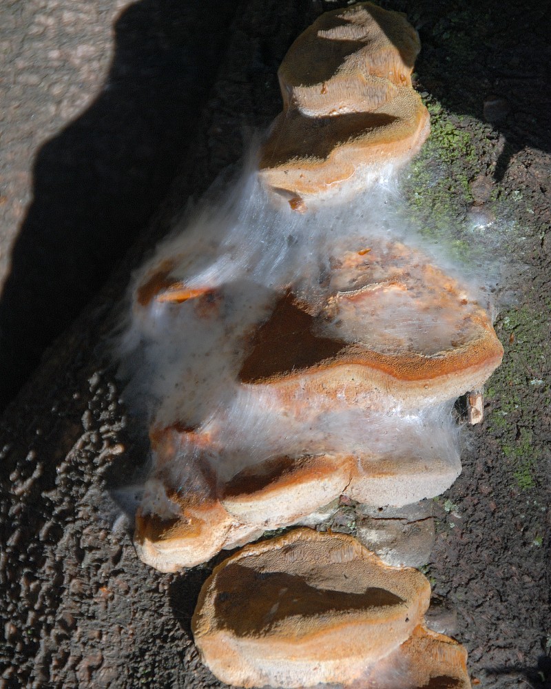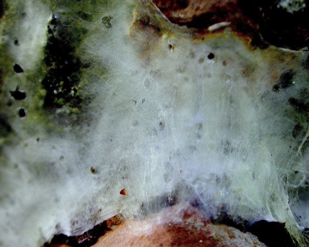 Buonasera a tutti, un mio amico micologo mi ha chiesto un parere in merito a delle produzioni sericee che si possono osservare su carpofori di Phellinus tubercolosus, un fungo poliporo che si sviluppa su diverse specie del genere Prunus con notevoli danni per la pianta. Ecco alcune foto in cui si vedono i corpi fruttiferi di questa specie sul tronco di un albicocco, ricoperti appunto da queste produzioni. I micologi mi hanno assicurato che non si tratta ovviamente di niente che appartiene al fungo e neanche a qualcosa di simile (ad esempio qualche specie di muffa) che ci cresce sopra. Poichè queste produzioni sono costituite da fili sericei mi è venuta in mente qualche specie di lepidottero che si nutre allo stadio larvale dei carpofori di questo poliporo e l'abbondante produzione di seta che li ricopre servirebbe a creare il microhabitat ottimale per questa fase dello sviluppo. Queste produzioni sono limitate ai soli funghi e non si riscontrano su nessun'altra parte della pianta. Esaminando allo stereomicroscopio la parte sericea ci ho trovato dentro dei piccoli bozzoli, formati dallo stesso materiale, ma con una trama più lassa, e contenenti almeno due tipi di esuvie pupali. Una è questa e penso sia quella del lepidottero responsabile delle produzioni sericee. L'altra è questa e penso sia quella di qualche imenottero suo parassita. Qualcuno può confermare le mie ipotesi e mi sa indicare qualche pubblicazione? Scusate per la qualità delle immagini allo stereo.
