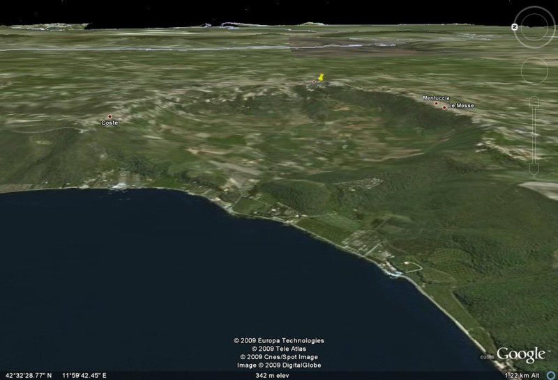 Ora Giuseppe/Pepper mi ha fornito anche altre informazioni (foto dell'interno della casa, indirizzo preciso, &c) che se vorrà e se sarà necessario fornirà pubblicamente, ma che per il momento non mi paiono indispensabile. Poche altre indicazioni si possono trovare in questa discussione su FNM. La cosa veramente interessante è la posizione della casa. Inserisco una elaborazione in Google Earth. Il segnaposto giallo indica la posizione (approssimativa) della casa.