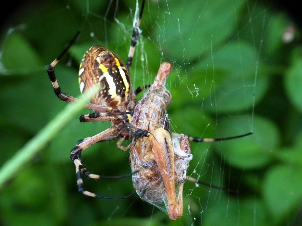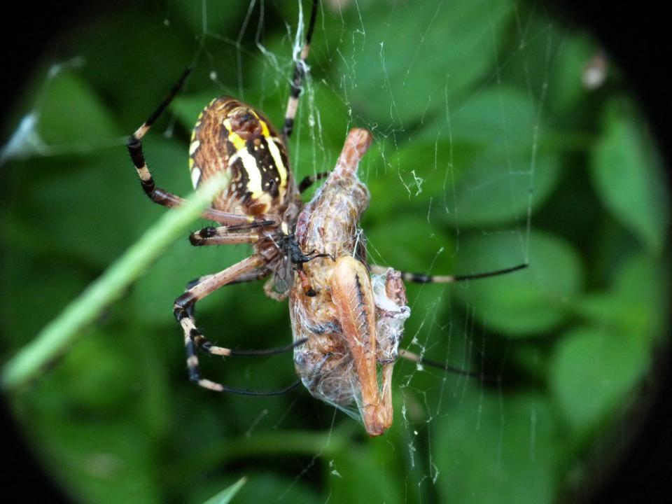 Un'Argiope bruennichi stava succhiando una cavalletta (ninfa di Eyprepochnemis plorans) avvolta nella ragnatela.