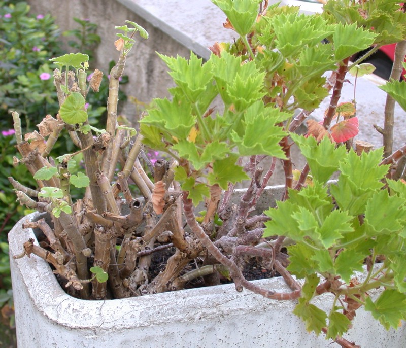 Ed io vi mostro la differente sensibilità delle diverse specie di pelargonio. La specie a foglie tonde sulla sinistra soppravvive a stento, quella a foglie dentate sulla destra non è attaccata.